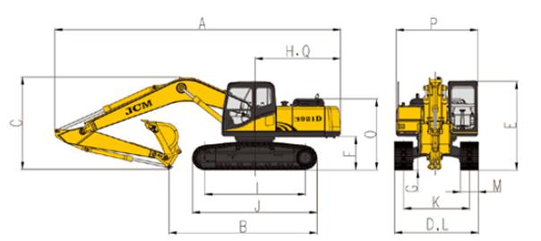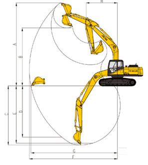 Electric rotary-type engine throttleTravel circuit 31.9MPa Swing circuit 25.5MPa Control circuit 3.9MPa Boom, Arm & Bucket Pilot control pump Gear type Boom cylinder 120mm×85mm×1285mm Main control valve Negative flow control Arm cylinder 135mm×95mm×1490mm Oil cooler Air cooled type Bucket cylinder 115mm×80mm×1120mm Swing System Refilling Capacities&lubrications Swing motor JEIL, Korea Fuel tank 360L Swing motor type Axial-piston motor Cooling system 25L Brake Hydraulic oil released Engine oil 20L Parking brake Hydraulic disc brake Hydraulic oil tank 250L Tank oil level Swing speed 11.5r/min 420L Hydraulic system Bucket Type Backhoe bucket Bucket capacity 0.9m3 (SAE) Bucket width 1230mm Arm Type A Max. digging depth 9281mm B Max. dumping height 6480mm C Max. digging height 6605mm D Max. vertical digging depth 5735mm E Max. Depth cut for 2440m(8')Level Bottom 6404mm F Max. digging distance 9845mm G Max. digging radius at ground level 9671mm H Min. swing radius of work equipment 3500mm Digging Force (ISO6015) Unit: kN Arm length 2925mm Bucket digging force 115kN Arm digging force 92.5kN Arm Type 2925mm A Overall length 9548mm I Tread 3360mm B Ground contact length (Transportation) 4947mm J Track length 4160mm C Overall height(to top of boom) 3073mm K Track gauge 2200mm D Overall width 2800mm L Track width 2800mm E Overall height(to top of cab) 2965mm M Shoe width 600mm F Counter weight ground clearance 1120mm O Bonnet height 2375mm G Ground clearance 470mm P Revolving frame width 2726mm H Tail swing radius 2905mm Q Distance from swivel center to tail 2853mm Operating Weight and Ground Pressure Operating weight includes basic machine (with boom 5.7m, arm 2.925m, and bucket 0.9m3) Shoe width 600mm Overall width 2800mm Ground pressure 45KPa Operating weight 20500kg